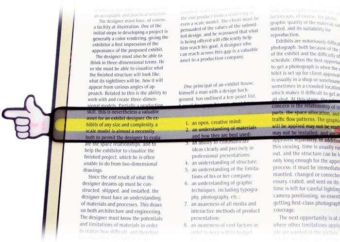 Nogle af legetanterne kan huske, at det hjalp at lære at læse ved at bruge en linial, der dækkede for ordene i næste række. I dag kan du få disse 12 smarte læse-pegefingre til dit barn, som gør det lettere at se, hvilken linje man er kommet til i bogen. Det unikke design er trykt på gennemsigtig plast. Læg læse-pegefingeren over læsebogen eller det næste kapitel om Harry Potter eller Vitello for at markere tekstens linje. Bogen kan være op til 22 cm bred, så markøren er også god til store bøger. En god hjælp til både nye læsere og til trætte studerende, hvor det kan være rart at have hjælp til at læse den ene side efter den anden. Læse-pegefingeren er også god til at sætte som markør, mens du slår et ord eller begreb op.