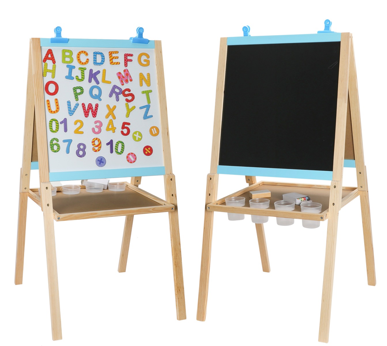 Praktisk tegnestaffeli med flere anvendelsesmuligheder. På den ene side er der en kridttavle, hvor dit barn kan tegne med kridt. På den anden side er der en magnettavle, som samtidig er en whiteboard.Til tavlen medfølger der 26 magnetiske bogstaver, 11 tal og + og - tegn. Der er også en tavlesvamp, to klemmer, 4 kopper og 10 tavlekridt.Tavlen giver mulighed for at tegne men også leg med bogstaver og tal.Den kan bruges indendørs, men også bæres ud, hvis vejret er til det.