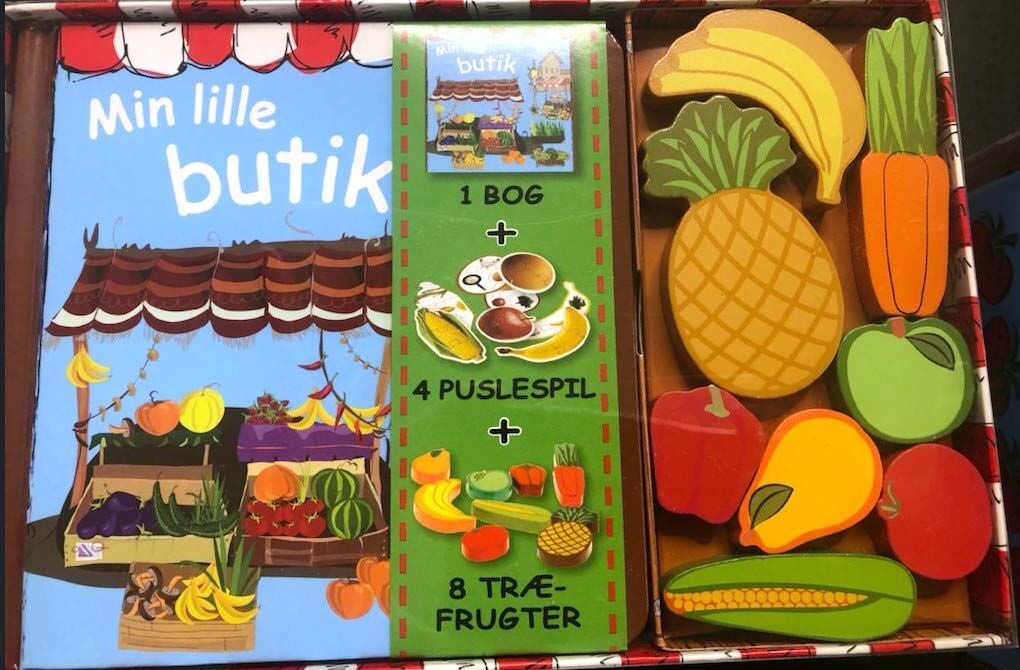 Aktivitetsæske fra Forlaget Globe med bog og frugter af træ. Anbefalet alder: fra 5-8 år.