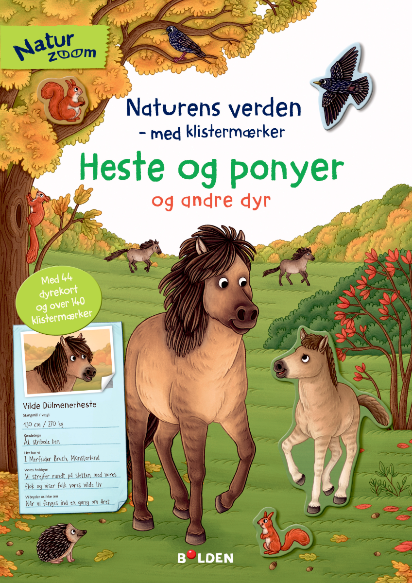 Denne aktivitetsbog har over 140 klistermærker. En del af dem kan dit barn sætte på hæftets 44 dyrekort med heste, ponyer og andre dyr. Dyrekortene gør bl.a. dit barn klogere på, hvad Balder Bavian og Heidi Hyænes livretter er. Og hvilket dyr med K der har et giftigt bid.Resten af klistermærkerne kan dit barn fx bruge til at pynte bogens 8 flotte landskabsbilleder.24 sider.