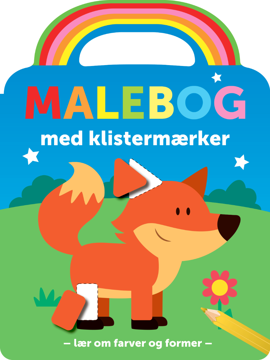 30 sider hvor dit barn lærer om farver og former. Slå op på en side og lad dit barn sammenligne venstre og højre side. Tegningerne på de to sider er ens men med farver på den ene side, som så mangler på den anden. På hvert opslag er der tomme pladser uden farve, som enten er trekantede, firkantede eller runde, og de passer med klistermærker, som sidder i midten af malebogen. Dit barn kan altså både farvelægge og hygge sig med at sætte klistermærker i den rigtige form og farve på de tomme pladser.