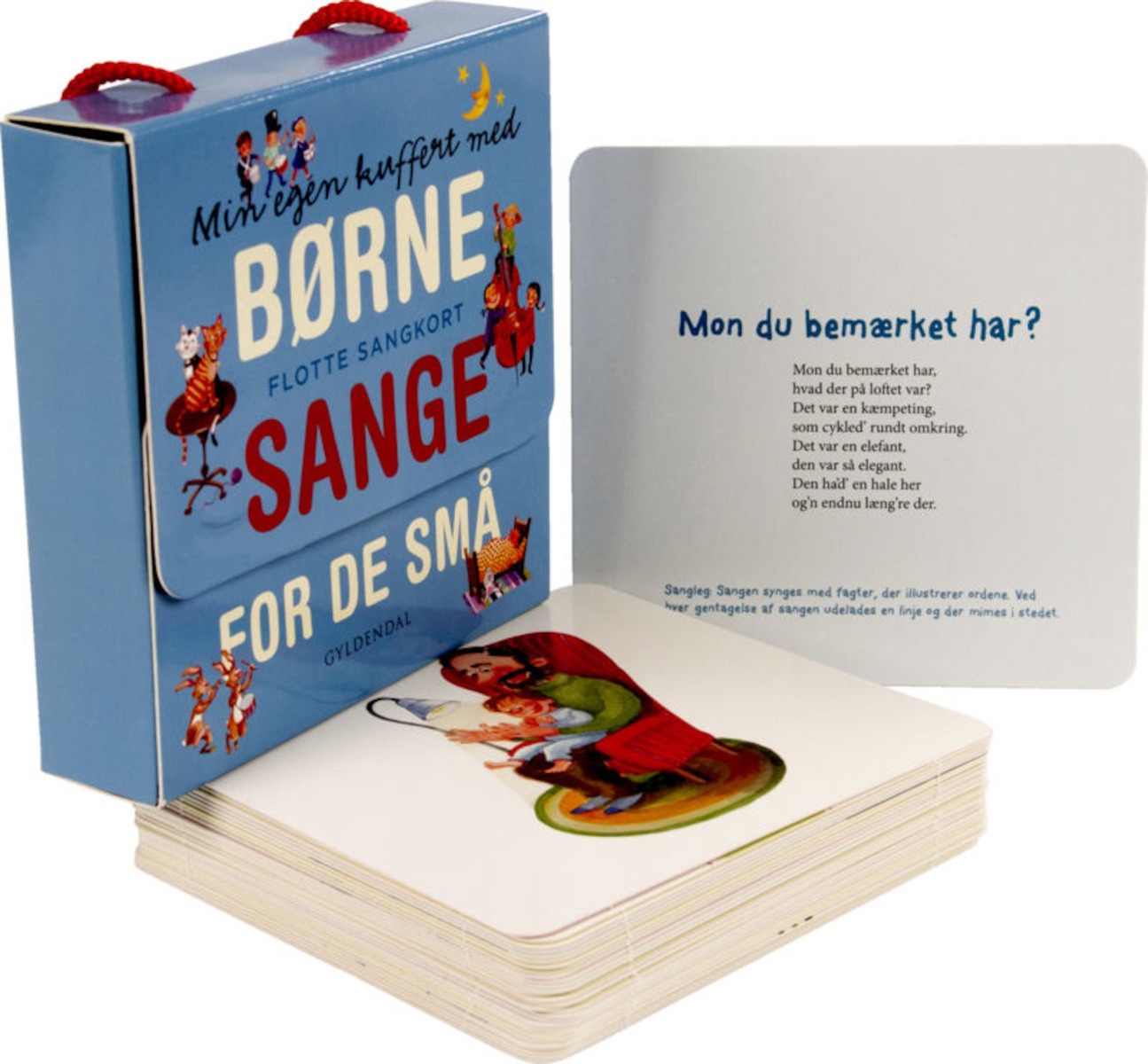 Hjulene på bussen, Mariehønen Evigglad og 28 andre klassiske, danske børnesange, som de små elsker at synge og klappe og danse til.I denne fine kuffert er der 30 tykke kort med sangtekster på den ene side og illustationer på den anden side. På den måde kan dit barn selv finde den sang, I nu skal synge, selvom læsetræningen måske er nogle år ude i fremtiden. Illustrationen hjælper på vej, og så kan du finde teksten på den anden side af kortet.At synge og lege musikalske lege udvikler dit barns hjerne og krop på en helt unik måde, fordi der skal bruges kompetencer fra begge hjernehalvdele. Når hjernen skal arbejde på tværs, bliver der dannet nye forbindelser, som gavner dit barns udvikling.Syng med dit barn fra fødslen.