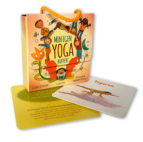 Kufferten indeholder 30 robuste kort med yogaøvelser, en remse på hvert kort og fine illustrationer, som viser, hvordan dit barn skal lave øvelsen. Kender I bogen Lyt til Løven med yogaøvelser? Så kender I allerede universet, som kufferten bygger på.Remsen gør det nemmere at huske yogaøvelsen - og faktisk gør yogabevægelserne det også nemmere at huske remsen. For forskning viser, at vi generelt har nemmere ved at lære sprog (og andre ting), når vi er i bevægelse. Når du dyrker børneyoga med dit barn, leger I værdifulde kompetencer ind: Koncentration, kropsbevidsthed og grovmotorik. Og netop koncentration, kropsbevidsthed og grovmotorik er med til at styrke dit barns evne til at lære nye ting og nye kompetencer.Yoga for børn og unge giver et tiltrængt pusterum i hverdagen, men det er også en virkelig god måde at lære sin krop at kende på.Tip: Brug sættet som et sjovt og hyggeligt indslag til en fødselsdag eller et andet event, hvor det er rart at kunne lave noget aktivt sammen.
