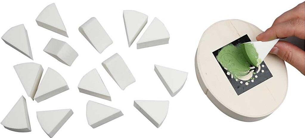 Disse trekantede, hvide skumsvampe er et alsidigt værktøj, der kan bruges til en lang række formål, herunder sminke og diverse duppeteknikker med alle typer maling. Skumsvampene er lavet af et...
