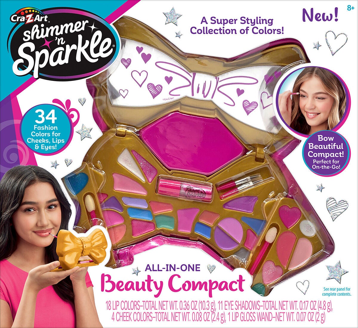 Sløjfeformet makeupsæt fra Shimmer n' Sparkle med et spejl. Det har flere læbefarver og mange øjenskygger i flotte farver. Makeupsættet har to lipglosser, to makeupbørster og klistermærkeark. Indeholder: 17 læbefarver, 11 øjenskygger, 2 applikatorer. Anbefalet alder: Fra 8 år.
