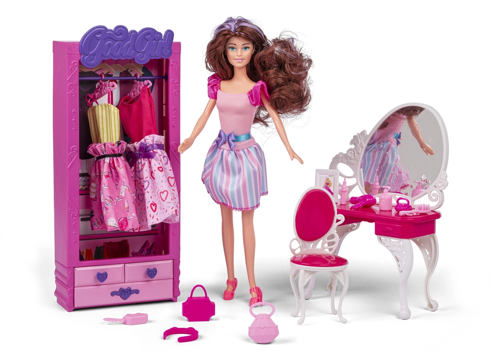 Judith med makeup-bord, kjoler og tilbehør