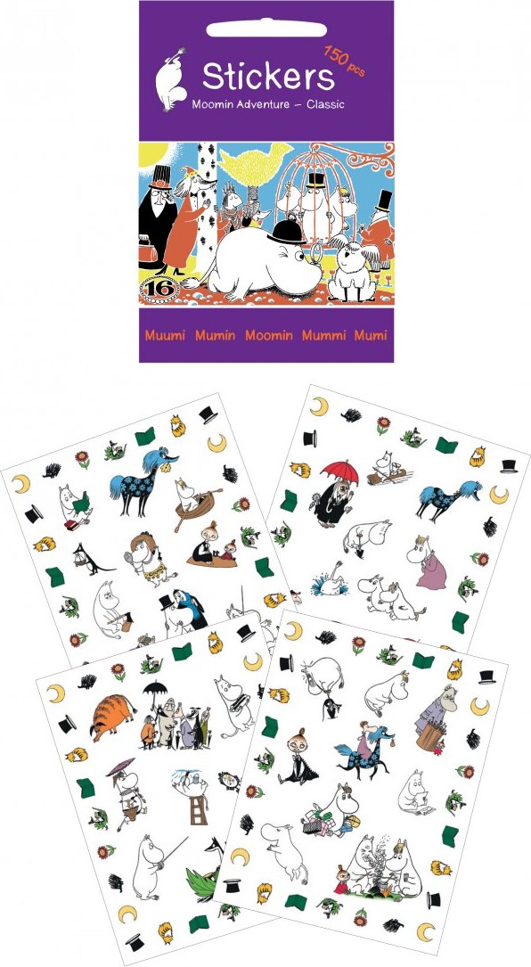 Klassiske Mumi stickers i smart indpakning. Pakken indeholder 4 ark med i alt 150 stk. Klistermærkerne forestiller den kendte Mumifamilie bl.a. Mumitrolden, Mumimor, Mumifar og Snorkfrøkenen....