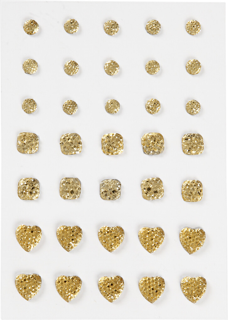 Rhinsten Klistermærker - Selvklæbende - Rund Firkant Hjerte - Guld - 35 Stk.