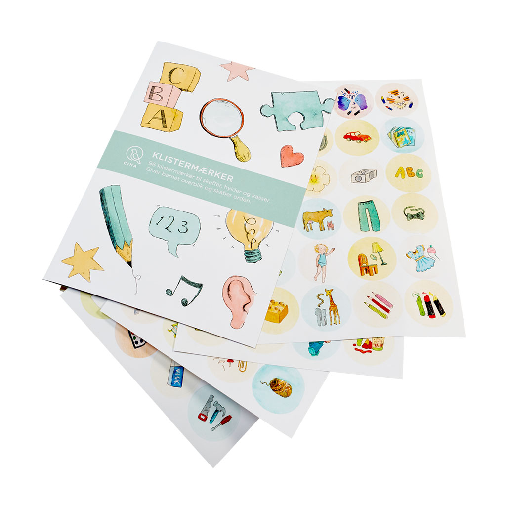 Vi giver ingen succes-garanti. Men hvis du bor sammen med et lille eller større rodehoved, så er disse 96 klistermærker en gevaldig hjælp til at blive bedre til at organisere legetøj og andre kære ejendele. Der er 96 klistermærker i sættet, og hvis de bare sætter gang i processen med at organisere og sortere, så er det første slag vundet. De fleste børn leger bare lidt bedre, når legetøjet og tøjskabet er til at sortere i, og der er intet som mærkater, der kan gøre den opgave realistisk. Faktisk er en af grundstenene bag den berømte Montessori-pædagogik netop ordentlighed og ryddelighed. Hvis du mangler inspiration til at organisere børneværelset, så kan du finde gode ideer baseret på Montessori-pædagogikken her på vores blog.Måske kan dit barn en dag selv varetage oprydningen på værelset (og sende 8 hamstere i kredsløb om jorden, holde vejret i 27 minutter og spille Der er et yndigt land på sækkepibe uden at bruge hænderne) en dag. Eller - måske skal du mere satse på, at dit barn gerne vil være med til at rydde op, og at dit barn sammen med dig vil nyde selvhjulpenheden i at kunne organisere sine sager med disse fine klistermærker.De er i hvertfald flotte, og det er da en start.