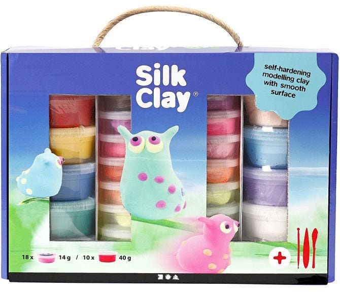 Sæt med blød, let modellervoks fra Silk Clay. Der medfølger forskellige dåser med flere, fine farver. Begynd at skabe i dag kun fantasien sætter grænser! Indeholder: 10 dåser à 40 g, 18 dåser à 14 g og 3 modelleringsværktøjer. Leveres i gaveæske (32,5x23x8,5 cm).