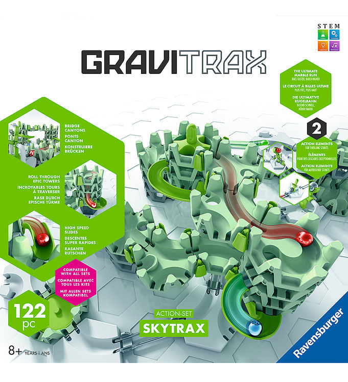 Med GraviTrax Kuglebane - Action Set - Skytrax får du mulighed for at bygge og designe din helt egen kuglebane. Dette sæt indeholder 122 dele, der giver uendelige muligheder for kreativitet og sjov. GraviTrax er kendt for sin høje kvalitet og innovative design, der sikrer timevis af underholdning for både børn og voksne.