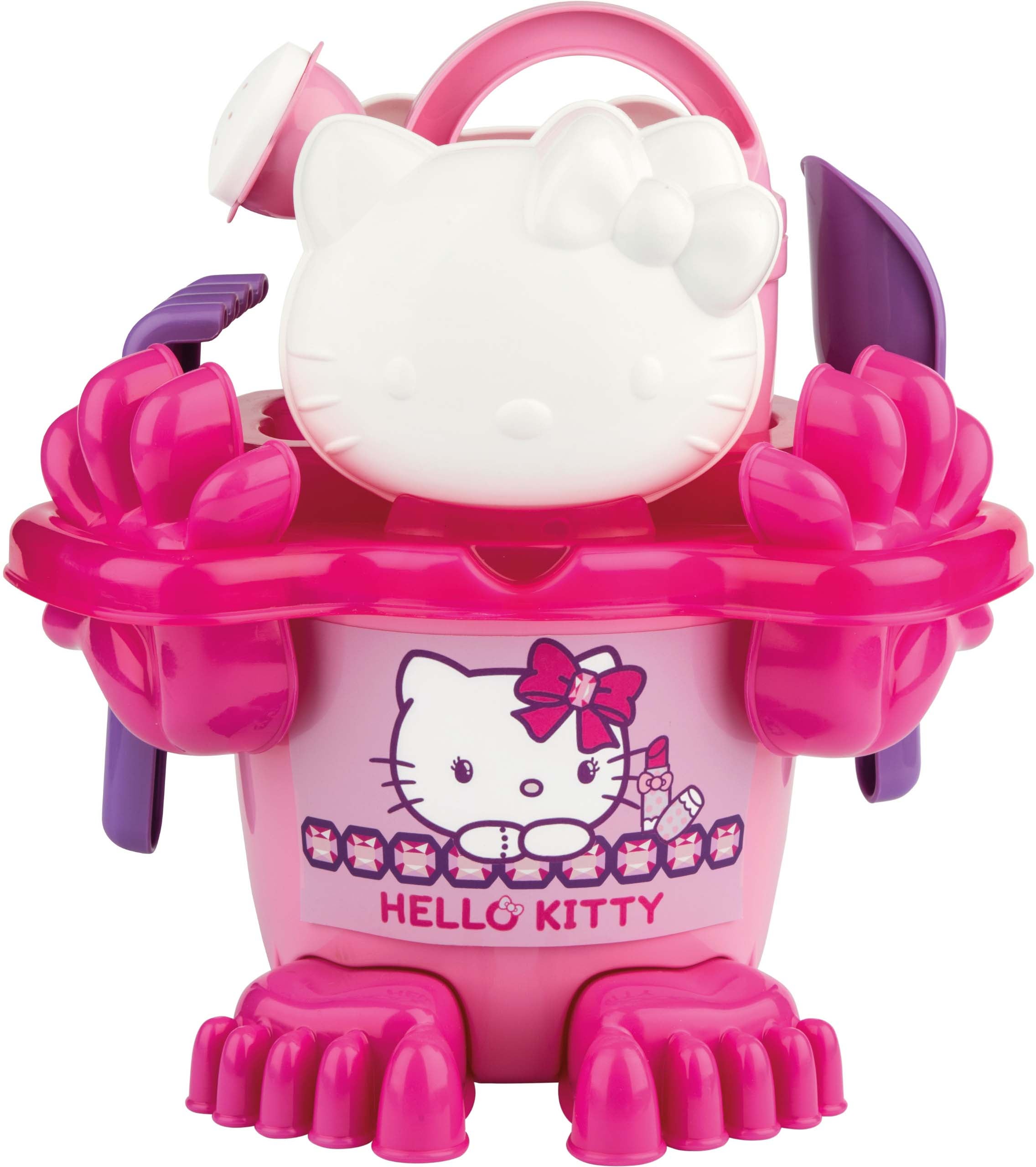 Sandsæt fra Hello Kitty med en masse spændende tilbehør. Perfekt til en dag på stranden. - Indeholder: 1 spand, 1 skovl, 1 si, 1 vandkande, 1 rive, 6 forme. - 11 dele. - Til leg på stranden eller i sandkassen. - Fine motiver. - Farverigt design. - CE-mærket. - Anbefalet alder: Fra 12 måneder. - Plastik.