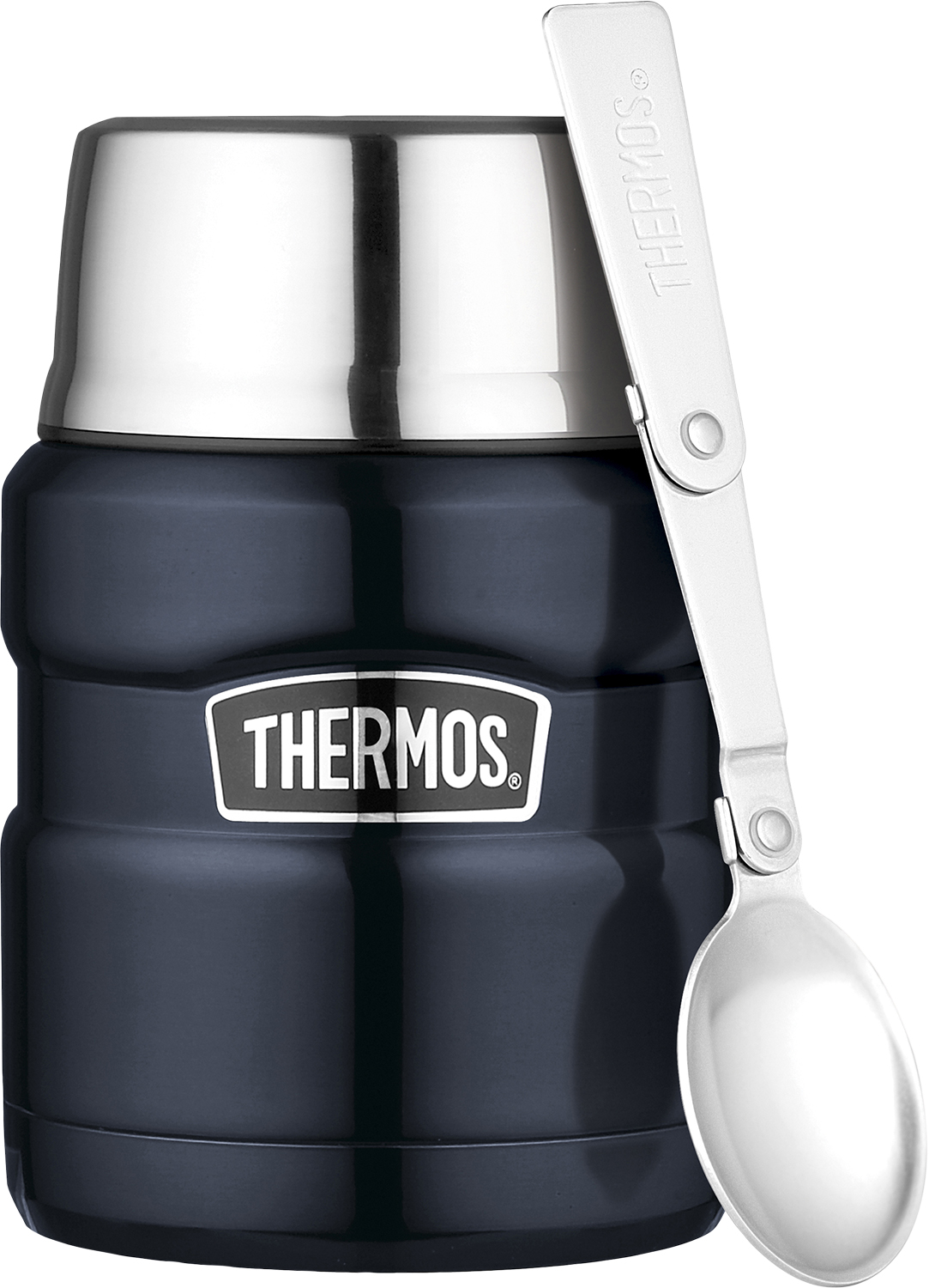 Thermos termoflaske 470 ml. Leveres med foldbar ske i rustfrit stål.Særdeles velegnet til suppe eller anden mad. Stål indvendig og udvendig med mørkeblå lakering.
