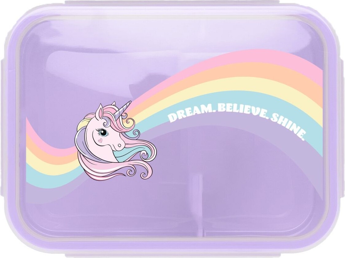 Tilføj lidt magi til frokosten med denne Tinka madkasse i lilla med et yndigt enhjørningemotiv....