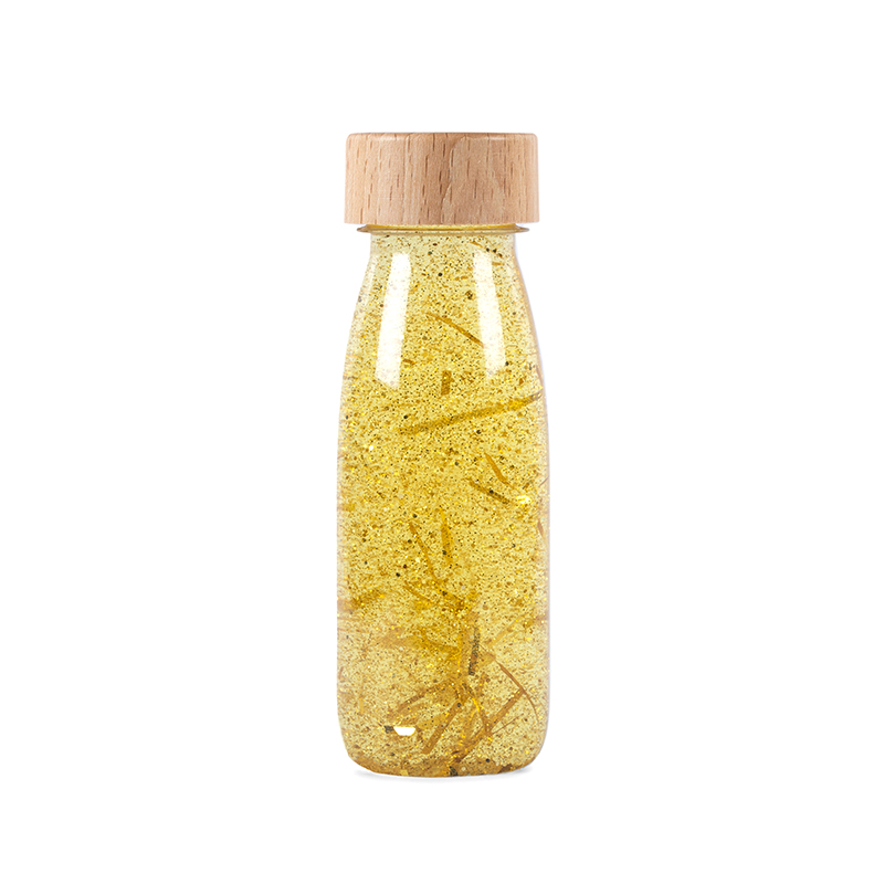 Fald til ro og tag en pause med at vende og dreje flasken og se det gyldne glitter glide rundt derinde. Af plast og med låg af træ.Fascinerende for de helt små, som fx kan lade flasken trille afsted og kravle efter den. Og dejlig til en tiltrængt hjernepause for de større børn. Brug fx flasken sammen med et lysbord eller i vindueskarmen. Flasken skal dog opbevares væk fra sollys, når legen er slut.Vejer cirka 300 gram.Må ikke nedsænkes i vand.