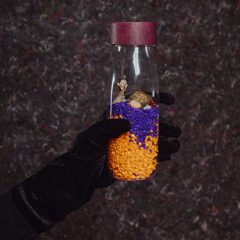Fald til ro og tag en pause med at vende og dreje flasken og se og høre de lilla, orange og sorte smådele rasle rundt derinde mellem græskar, fugleskræmsel og trylleeliksirbog.Af plast og med låg af træ.Fascinerende for de helt små, som fx kan lade flasken trille afsted og kravle efter den. Til større børn er den også dejlig til en tiltrængt hjernepause. Brug fx flasken sammen med et lysbord eller i vindueskarmen. Flasken skal dog opbevares væk fra sollys, når legen er slut.Vejer cirka 300 gram.Må ikke nedsænkes i vand.