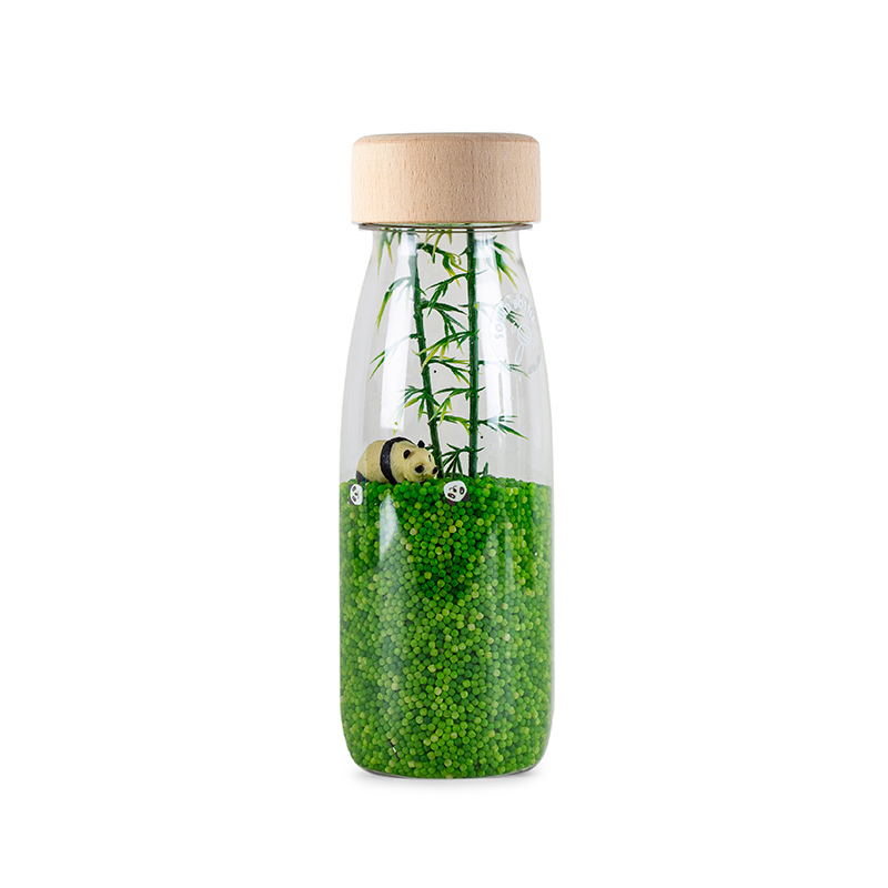 Fald til ro og tag en pause med at vende og dreje flasken se og høre pandaerne rasle rundt derinde i det grønne bambusunivers. Af plast og med låg af træ, der tåler at blive gumlet på af en baby.Fascinerende for de helt små, som fx kan rasle med flasken og rulle den afsted for at kravle efter den igen. God til at øve forholdsord som ovenpå og under. Og dejlig til en tiltrængt hjernepause for de større børn. Vejer cirka 300 gram.Tåler ikke at blive sænket ned i vand - og har heller ikke godt af at stå i sollys i længere tid.