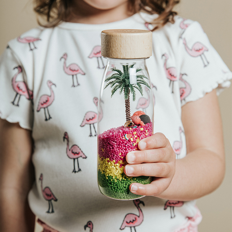 Fald til ro, kom i feriestemning og tag en pause med at vende og dreje flasken se og hør flamingoen, kokosnøden og de andre dele rasle rundt derinde. Af plast og med låg af træ, der tåler at blive gumlet på af en baby.Fascinerende for de helt små, som fx kan rasle med flasken og rulle den afsted for at kravle efter den igen. God til at øve forholdsord som ovenpå og under. Og dejlig til en tiltrængt hjernepause for de større børn. Vejer cirka 300 gram.Tåler ikke at blive sænket ned i vand - og har heller ikke godt af at stå i sollys i længere tid.