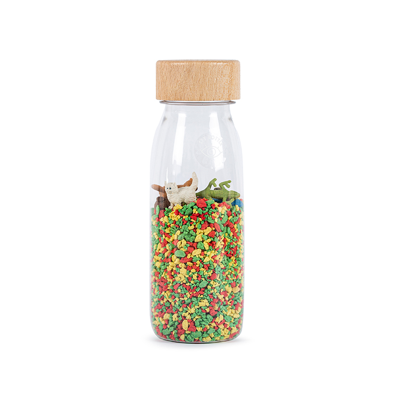 Tag en pause og find ro ved at vende og dreje flasken og se og høre kæledyrene rasle rundt blandt de kulørte småsten. Et hæfte med forslag til lege med sprog og ordforråd fra 18 mdr. følger med. Hæftet er på engelsk, fransk, spansk, tysk, italiensk og hollandsk.Af plast og med låg af træ, der tåler at blive gumlet på af en baby.Fascinerende for de helt små, som fx kan rasle med flasken og rulle den afsted for at kravle efter den igen. God til at øve forholdsord som ovenpå og under. Og dejlig til en tiltrængt hjernepause for de større børn. Vejer cirka 300 gram.Tåler ikke at blive sænket ned i vand - og har heller ikke godt af at stå i sollys i længere tid.