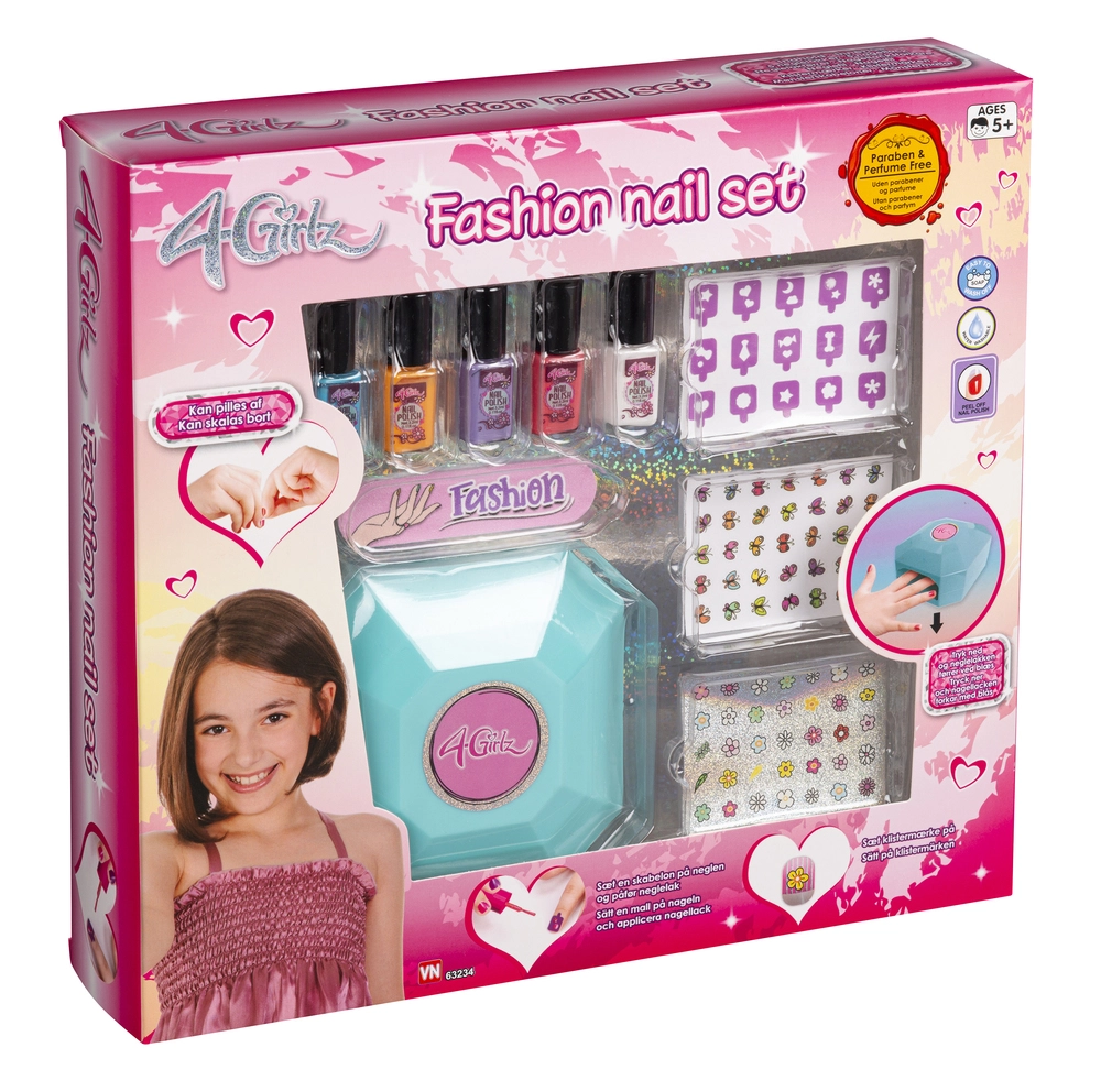 Fashion neglesæt Sæt med batteridrevet neglelaktørrer, 5 neglelakker, neglefil, mønsterskabeloner og klistermærker. Ekskl. 2 stk. AA-batterier.