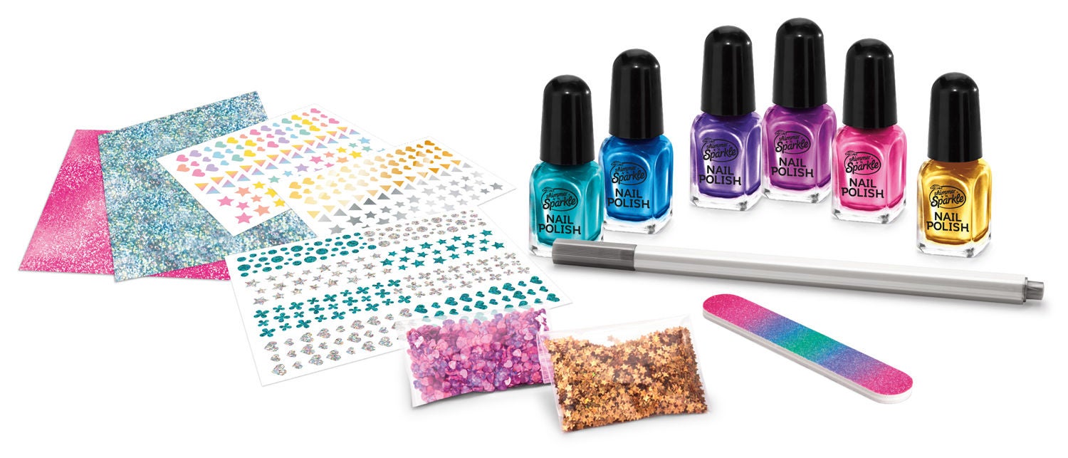 Sæt bestående af kunstige negle og neglepynt fra Shimmer ´n Sparkle. Neglesættet indeholder kunstige negle, neglelak i metalliske regnbuefarver, tusser, glitrende negledekorationer samt en neglefil. Gør dine negle fine ved at bruge din kreativitet til at give dem det design, du ønsker. Anbefalet alder: Fra 8 år.
