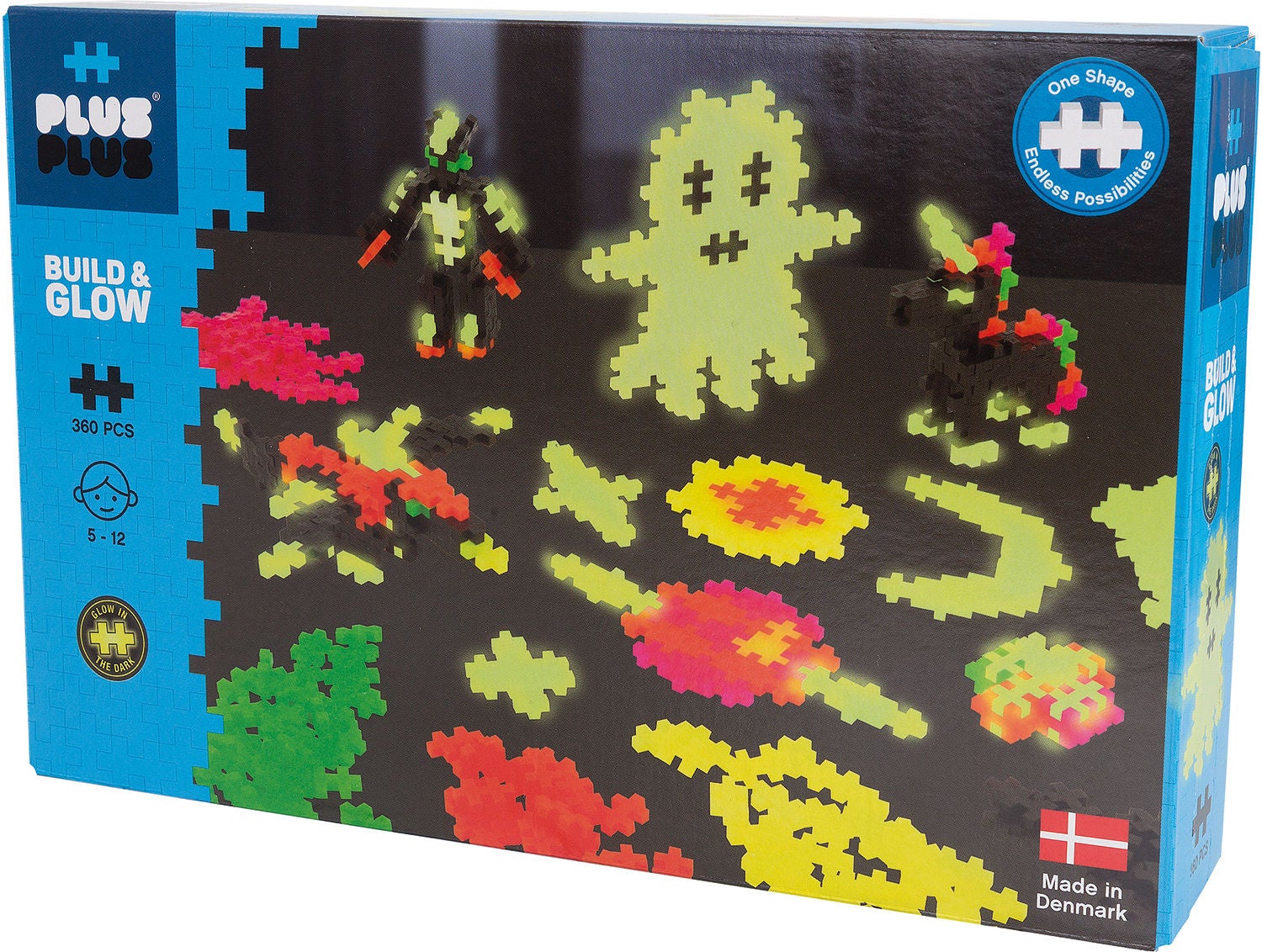 Med Plus-Plus kan du bygge både to- og tredimensionelt. Plus-Plus delene kommer i forskellige farver og giver dig en sjov og kreativ mulighed for at konstruere forskellige ting. I dette sæt får du 360 dele, der lyser i mørke. Byg et selvlysende spøgelse eller en rumenhjørning? Det er bare fantasien, der sætter grænsen. Anbefalet alder: fra 5 år.