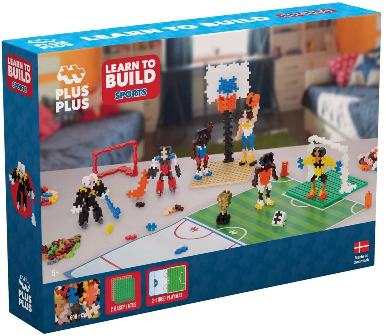 Alsidigt byggesæt fra Plus-Plus med et dobbeltsidigt legetæppe til små sportsfans. Genskab dit yndlingshold, eller opfind din egen sportsgren! De kreative muligheder er uendelige. - Indeholder: 600 Plus-Plus-klodser, 2 byggeplader, 1 legetæppe. - Designet og produceret i Danmark med 100 % grøn energi. - CE-mærket. - Uegnet for børn under 3 år på grund af små dele.