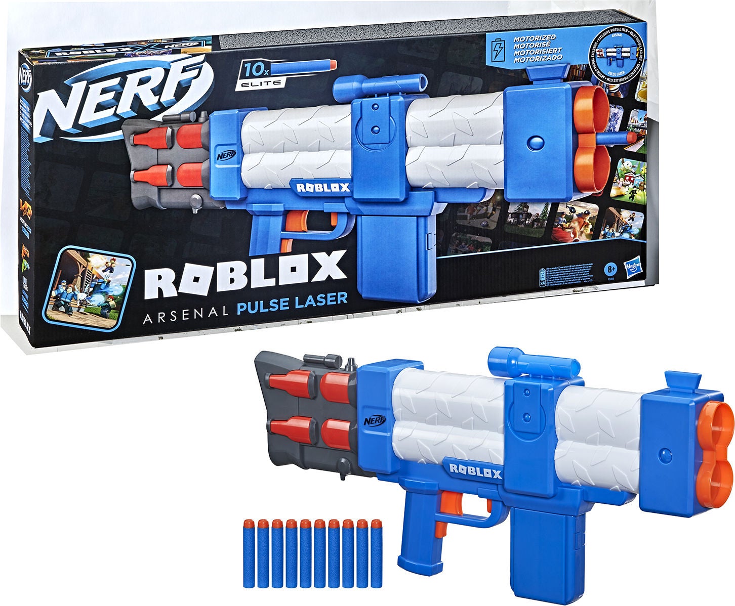 Stor blaster, der er inspireret af det populære videospil, Roblox Arsenal. Blasteren har et stort 10-pils-magasin, så du kan affyre mange pile ad gangen. Du kan en pil ad gangen, eller på automatik, så alle 10 pile affyres hurtigt lige efter hinanden. Der medfølger 10 officielle Nerf-pile. Anbefalet alder: Fra 8 år.
