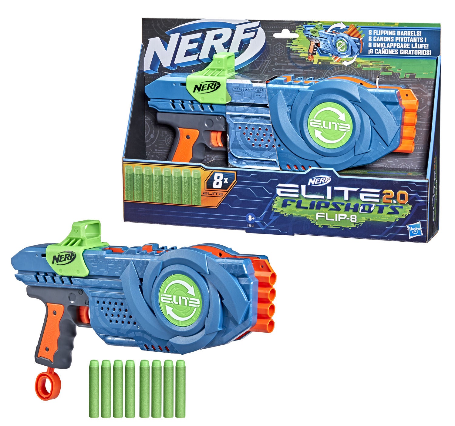 Blasteren Flip-8 fra NERF Elite har otte roterbare løb, så du hurtigt kan få dine pile afsted i hurtig rækkefølge. Affyr først fire pile og roter derefter løbet for at affyre fire mere. Der medfølger otte pile. Anbefalet alder: Fra 8 år.