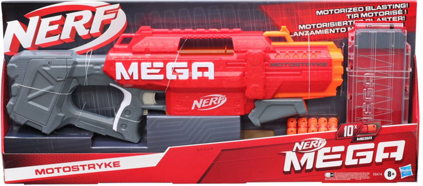 Nerf Mega Motostryke er en sej blaster, der kan holdes i én hånd. Megablasterne kan affyre sine mega-pile op til 26 meter. Når du har ladt cylinderen kan du affyre alle ti piile, uden at skulle genlade. - Ti Mega Whistler-pile medfølger Anbefalet alder: Fra 8 år.