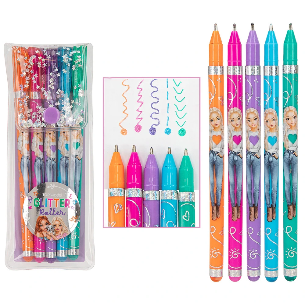 Tilføj glitter detaljer på dine tegninger, breve m.m. Fem fine gelpenne fra TOPModel. Perfekte til at give ekstra flotte glitter detaljer og effekter på dine tegninger, scrapbøger, breve eller lign. Ekstra sej detaljer: Flydende stjerne-glitter-konfett