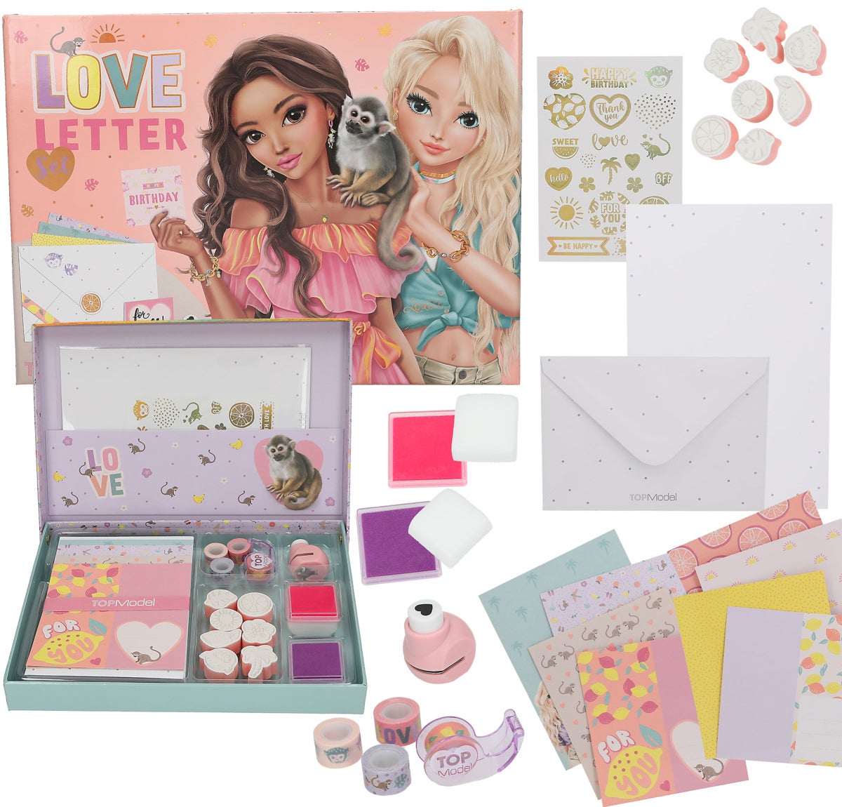 DIY brevpapir-sæt fra TOPModel med en masse spændende tilbehør, som kan kombineres på mange kreative måder. Det har et sødt tema. Perfekt til timevis af fantasifuld leg. - Indeholder: 1 postkasse, 10 brevpapirark, 10 kuverter, 1 klistermærkeark, 4 taperuller, 2 blækpuder, 7 stempler. - Lav dine egne breve og send dem til dine venner! - Slip kreativiteten løs. - Udvikler kognitive og finmotoriske færdigheder. - CE-mærket. - Anbefalet alder: Fra 4 år. - Papir, plastik, gummi.