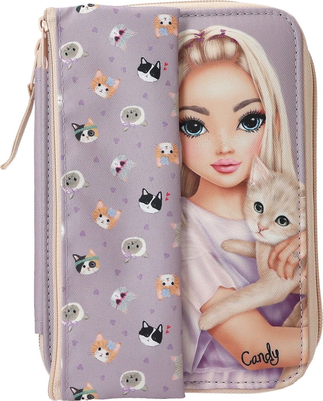 Det lilla TOPModel penalhus har et stort motiv af en model med en killing på forsiden. Øverst...