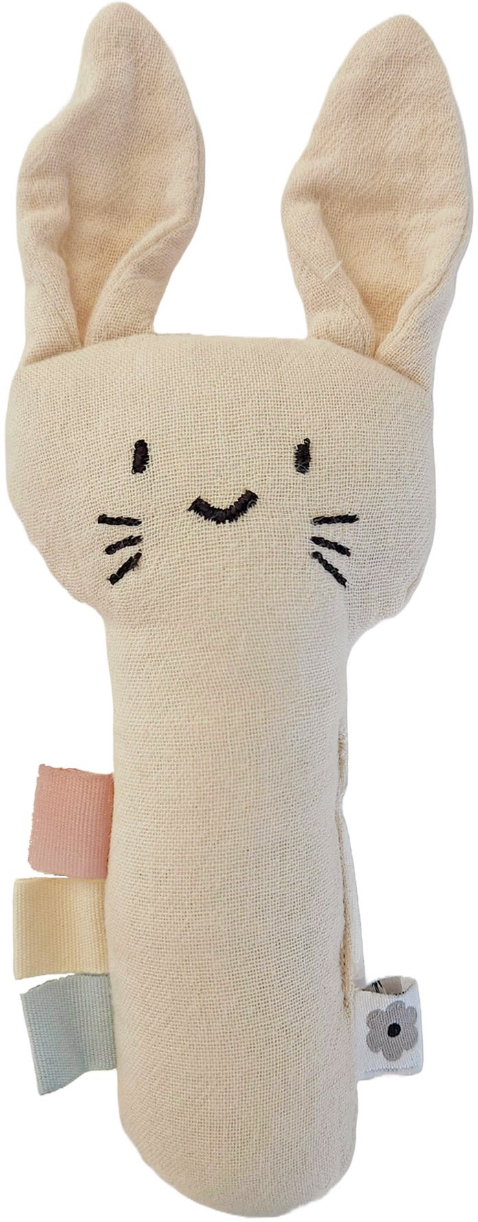 Blød, kaninformet rangle fra Summerville. Perfekt ven til både lege- og sovetid. - Blødt materiale. - Fine farver. - Masser af søde detaljer. - Raslelyde, der stimulerer barnets høresans. - Produktet er certificeret efter Oeko-Tex® 100, hvilket sikrer, at det ikke indeholder skadelige kemikalier. - Anbefalet alder: Fra nyfødt. - Økologisk bomuld, polyester.