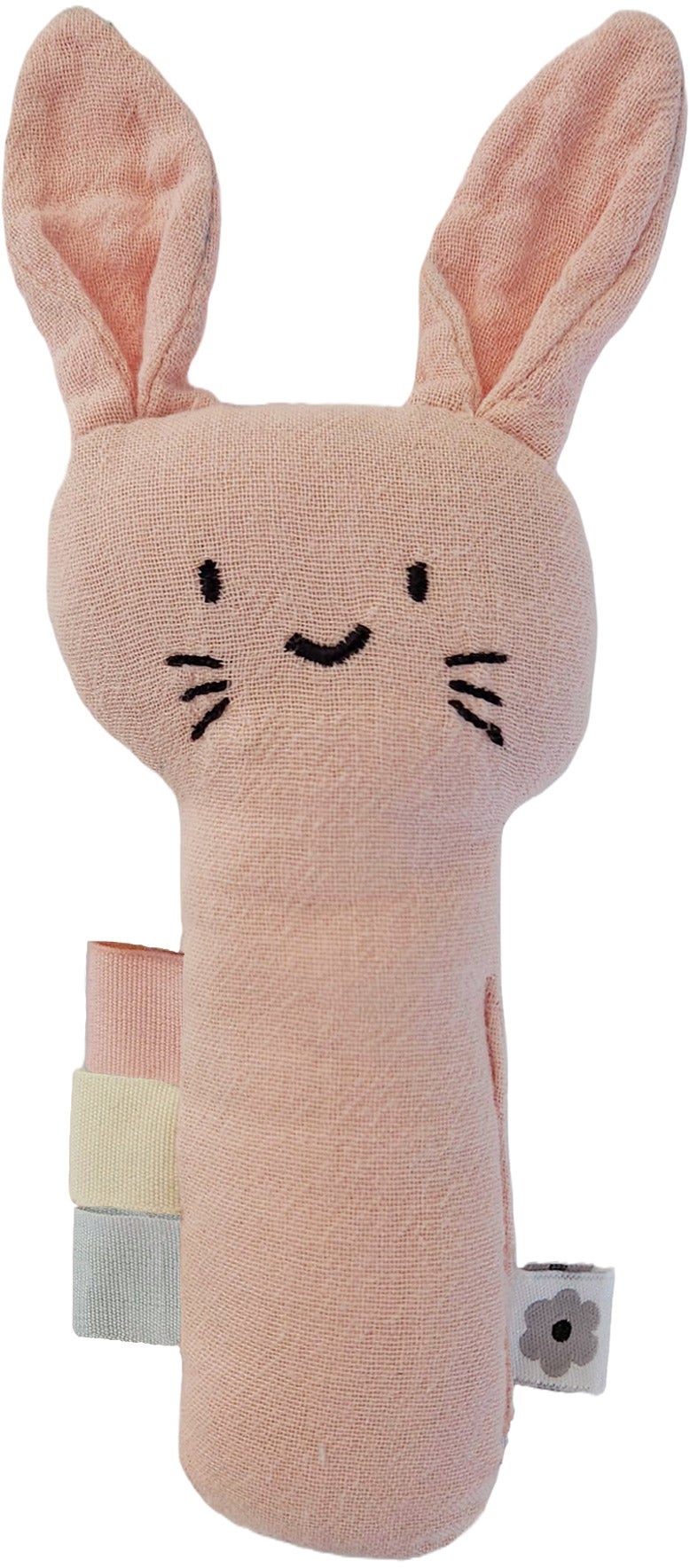 Blød, kaninformet rangle fra Summerville. Perfekt ven til både lege- og sovetid. - Blødt materiale. - Fine farver. - Masser af søde detaljer. - Raslelyde, der stimulerer barnets høresans. - Produktet er certificeret efter Oeko-Tex® 100, hvilket sikrer, at det ikke indeholder skadelige kemikalier. - Anbefalet alder: Fra nyfødt. - Økologisk bomuld, polyester.