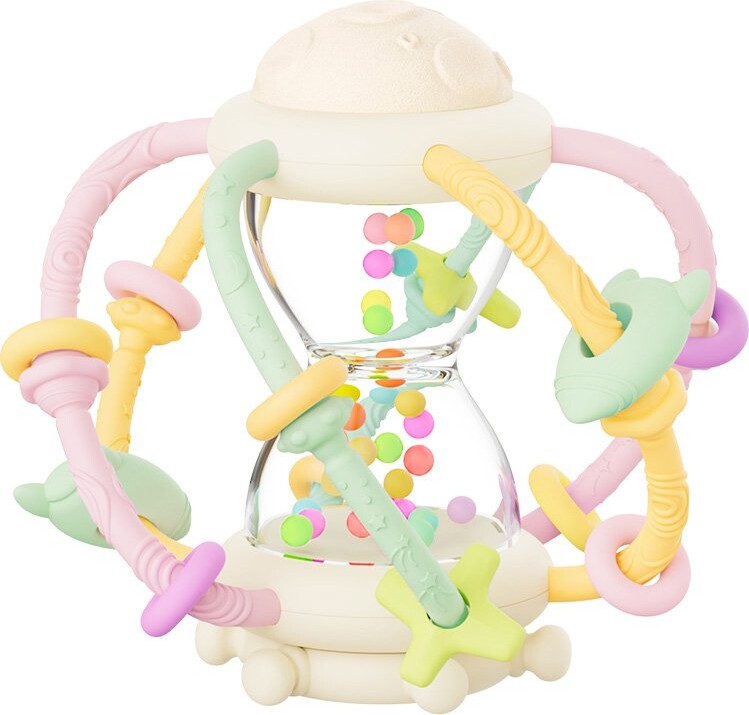 Den interaktive timeglasrangle er designet til at stimulere barnets sanser og motoriske færdigheder. Når dit barn ryster ranglen, høres en dejlig raslelyd, som opfordrer til leg og nysgerrighed. De farverige perler indeni bevæger sig elegant op og ned, hvilket skaber visuel stimulering og fanger barnets opmærksomhed.