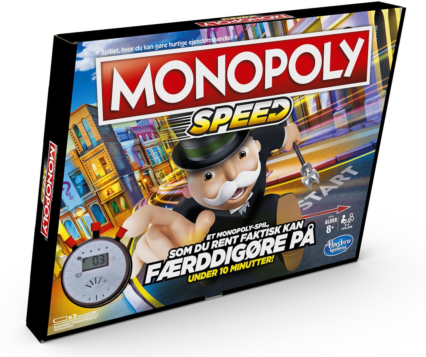 Det klassiske brætspil Matador i en hurtig udgave. I spillet Monopoly Speed skal spillerne ikke skiftes til at slå med terningen, for når terningen er kastet kan alle købe på samme tid. Sæt timeren og spil Monopoly Speed på 10 minutter. Anbefalet alder: Fra 8 år.
