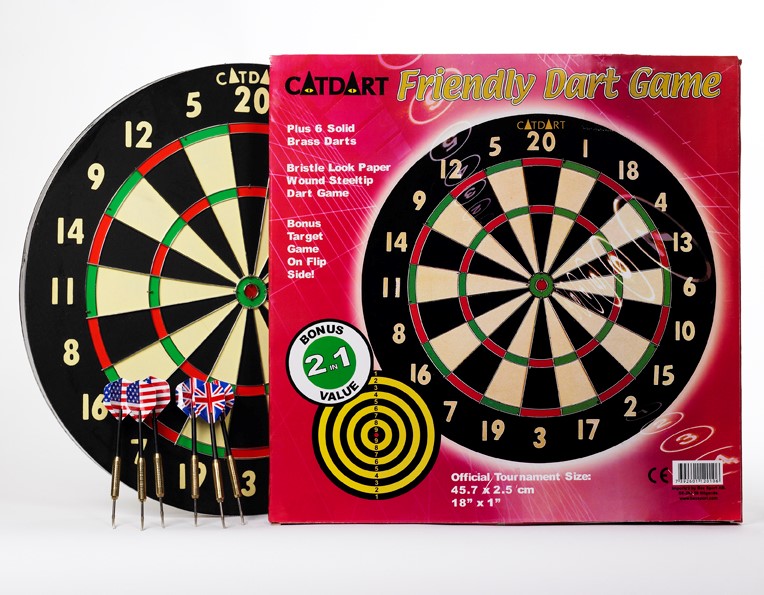 Så skal der trænes grovmotorik og koncentration, når der skal høstes point i en dartdyst.Skiven kan vendes om, hvor der er en target skive på bagsiden.Sættet vejer 4 kg.Der medfølger 2 sæt pile (6 stk. i alt).Pilene har aftagelige mellemstykker og flights.Sætter I skiven op i haven, så sørg for, at I ikke ved et uheld, har mulighed for at kaste en pil over i naboens have eller andre upassende steder.Lidt info om dartskivens placering: En dartskive skal hænge således, at centrum på Bulls Eye er i en højde på 173 cm fra gulvet. Kasteafstanden til skiven er 237 cm målt fra skivens forkant.