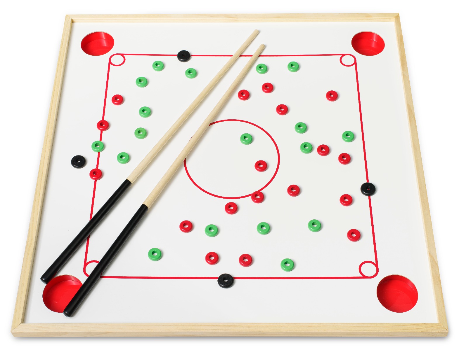 Klassisk bobspil, som er lige til at flytte rundt på, der hvor man vil dyste. Placer det på havebordet, når vejret er godt eller ryd lidt plads omkring spisebordet, når det er indevejr.Spilleregler:1) I spillet kan der deltage 2-4 spillere. Hvis man er 4, spiller man på hold to og to.2) Inden spillet starter, vælger spillerne farve. Rød eller grøn.3) Brikkerne blandes undtagen stødbrikkerne.4) Nu kan spillet begynde. Træk lod om eller aftal, hvem der skal starte.5) Når det lykkes at støde en af sine brikker i hul, får man endnu et stød. Skyder man i stedet modstanderens brikker i hul, så hjælper man i stedet sin modstander.6) skyder man en stødbrik i hul, får man som straf to af sine egne brikker ekstra ind i spillet og modstanderen placerer dem.Udover spillepladen indeholder spillet:2 køer34 ringe4 stødbrikker