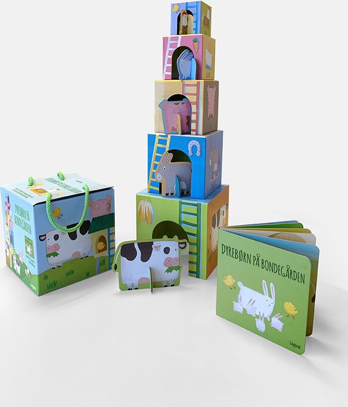 Sød og praktisk æske med stabeltårn, dyrefigurer og bog med fine og sjove illustrationer af bondegårdens dyrebørn. Indeholder: Billedbog på 10 sider 5 flotte kasser med dyr og tal på 5 søde...