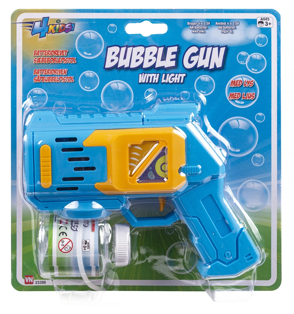 Batteridrevet sæbeboblepistol med lys Inkl. sæbeboblevand. Ekskl. 4 stk. AA-batterier.