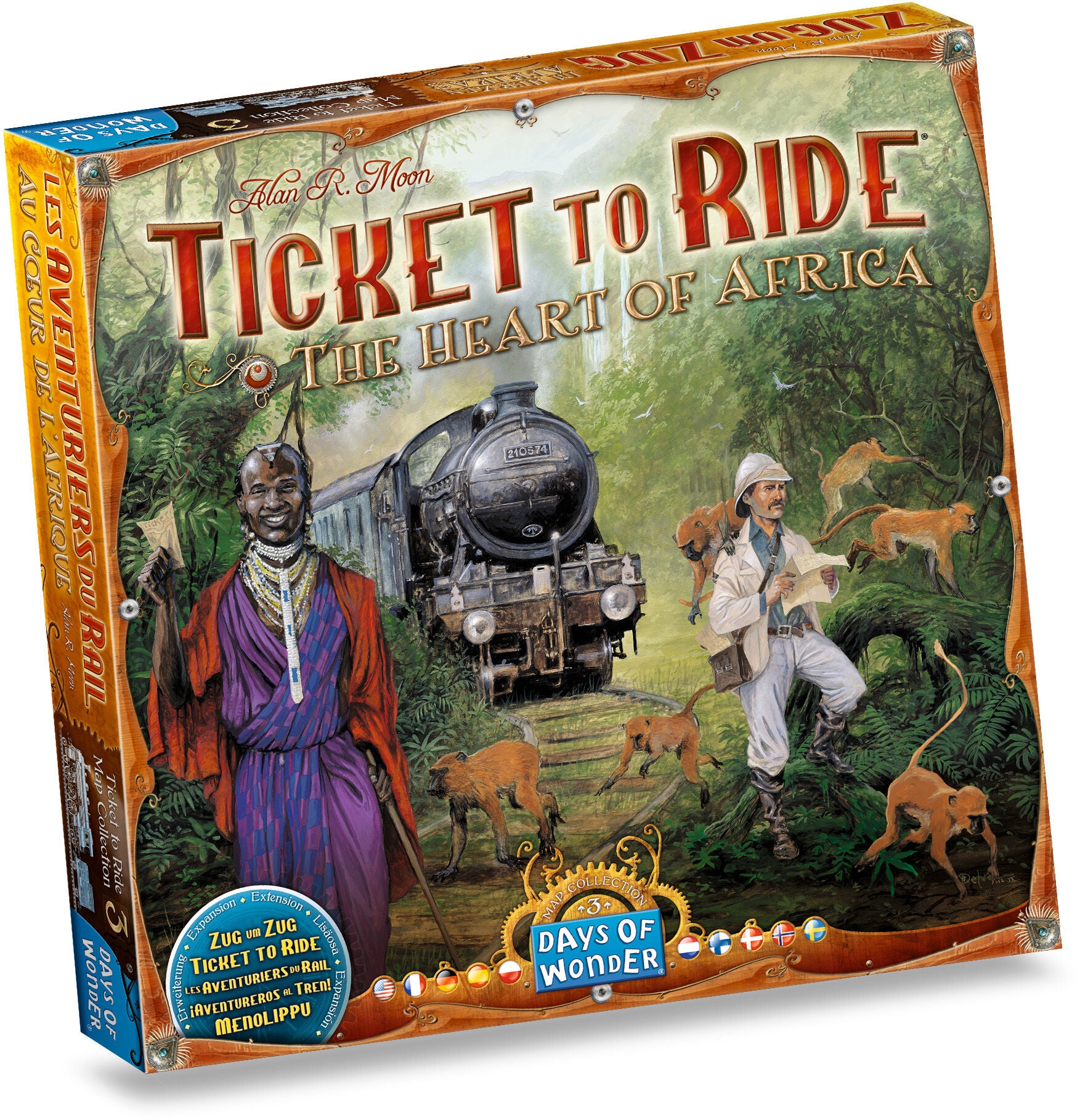 Nu præsenteres den tredje udgave i Ticket to Ride Map Collection The Heart of Africa. Det nye ensidede kort udspiller sig i Afrikas vidstrakte vildmark, da den var helt uudforsket af frygtløse opdagelsesrejsende, missionærer og eventyrere. Fokus ligger på kontinentets centrale og sydlige hjerte i et vertikalt format. Det nye kort introducerer 45 nye terrænkort, der er opdelt i tre forskellige terræntyper. Hver terræntype er forbundet med forskellige farver: kort til gule, orange og røde ruter betyder ørken og savanne, grønne, blå og lilla ruter betyder jungle og skov, sorte, hvide og grå ruter betyder bjerge og klipper. Spillerne kan trække terrænkort i stedet for togvognskort, og de kan bruge dem til at øge værdien på de ruter, som de gør krav på. Anbefalet alder: Fra 8 år.