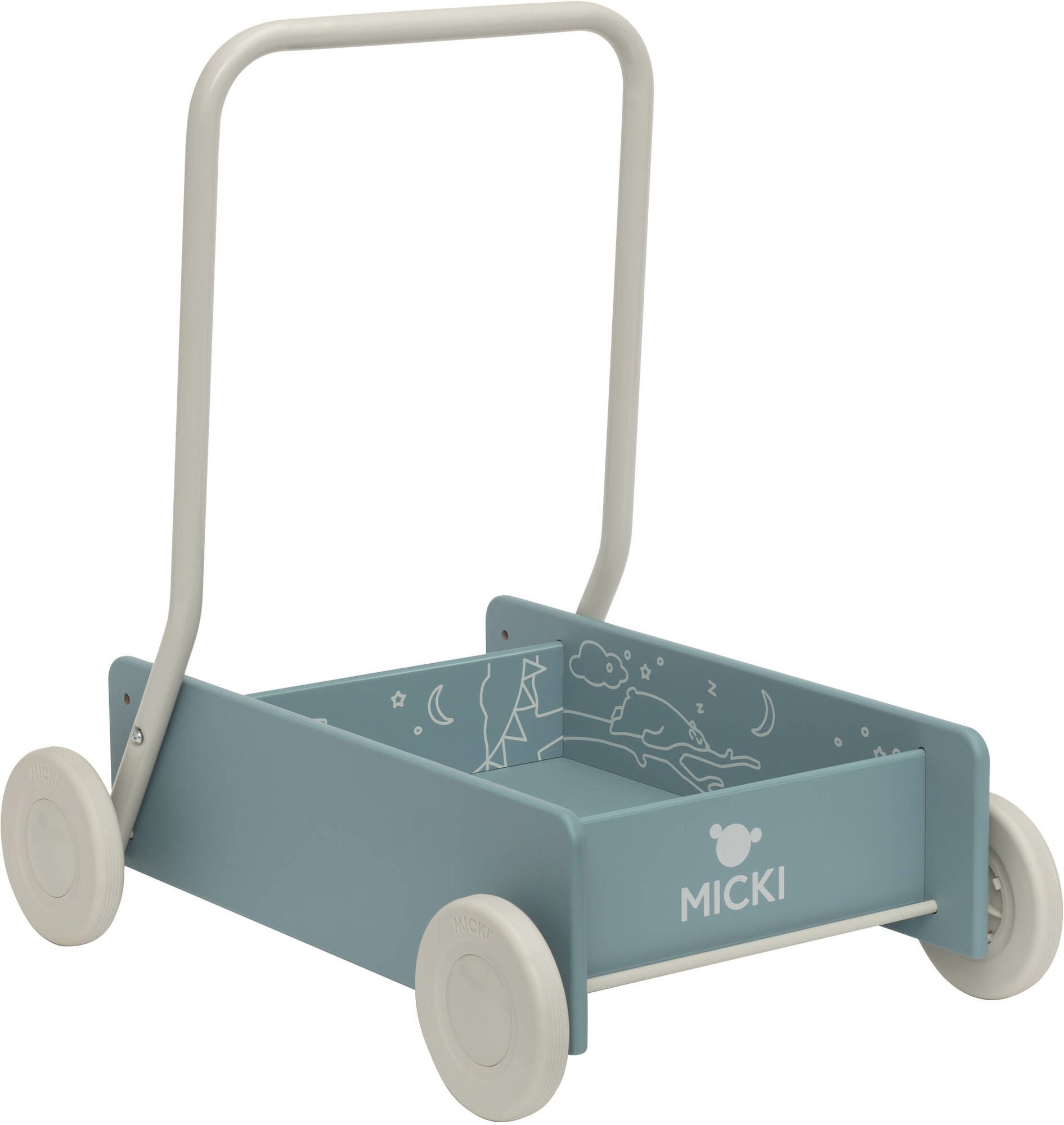 Klassisk gåvogn fra Micki i træ med bremsebare, PVC-frie hjul. Den har et justerbart håndtag. Gåstolen giver stabil og sikker støtte til barnets første skridt. CE-mærket. Anbefalet alder: Fra 6 måneder. Træ, MDF.