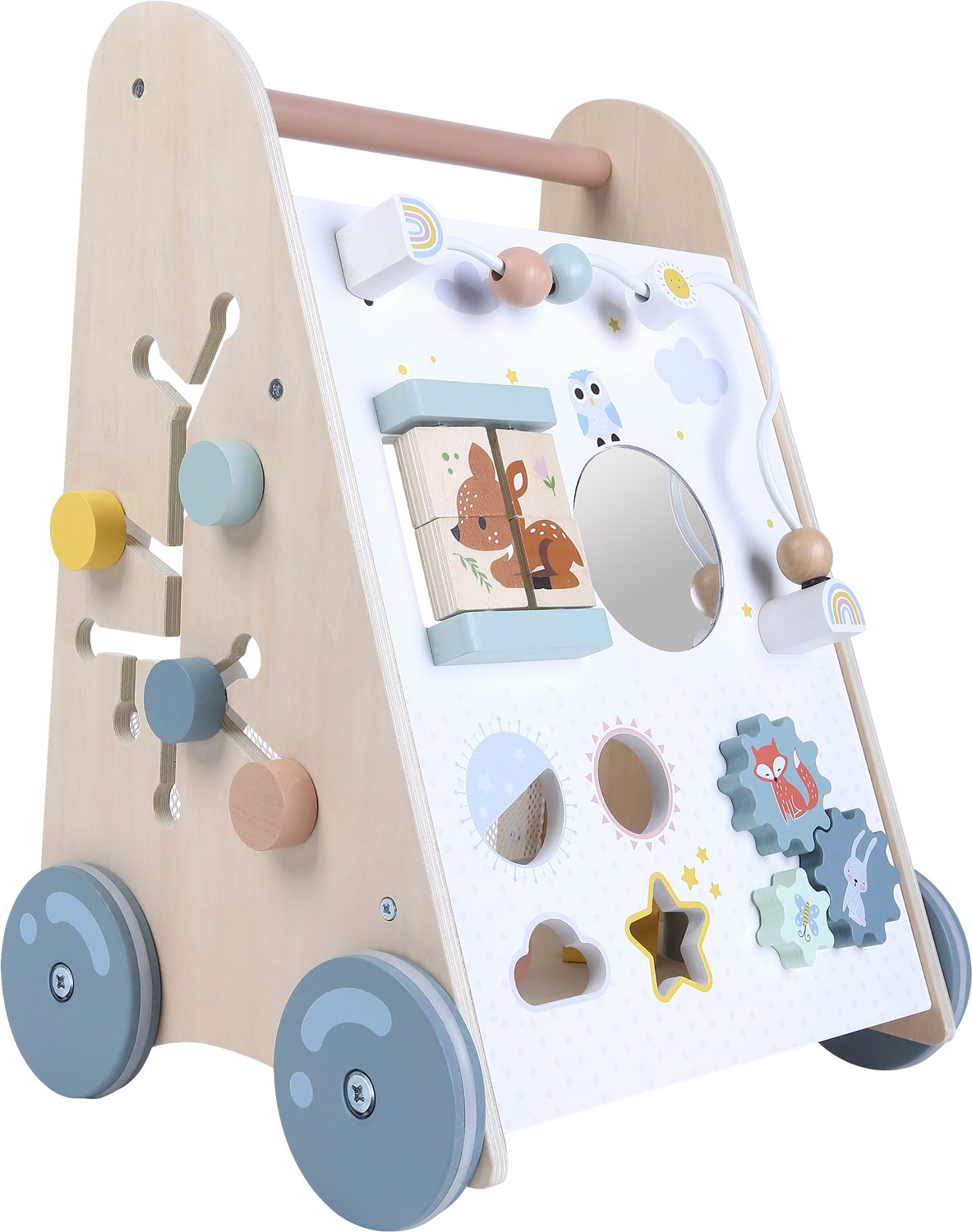Aktivitetsgåvogn i træ Med mange forskellige aktiviteter.