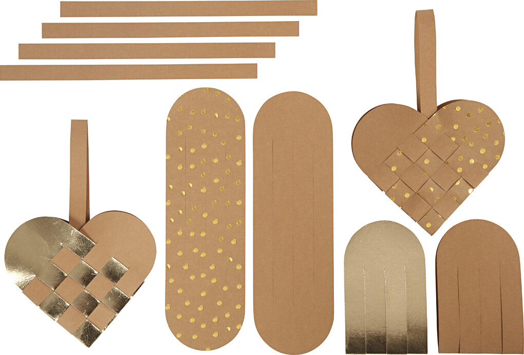 Materialesęt med udstansede dele til 4 flettede hjerter i tre designs, som evt. kan mixes. Incl. hanke i natur. Indhold: Udstansede hjerteskabeloner til 2 hjerter i natur, 1 hjerte i guld og 1 hjerte...