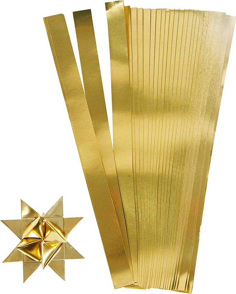Disse stjernestrimler er perfekte til at skabe smukke og dekorative flettede stjerner. Pakken indeholder i alt 100 papirstrimler i guld, som er velegnede til julestjerner, guirlander og meget andet....