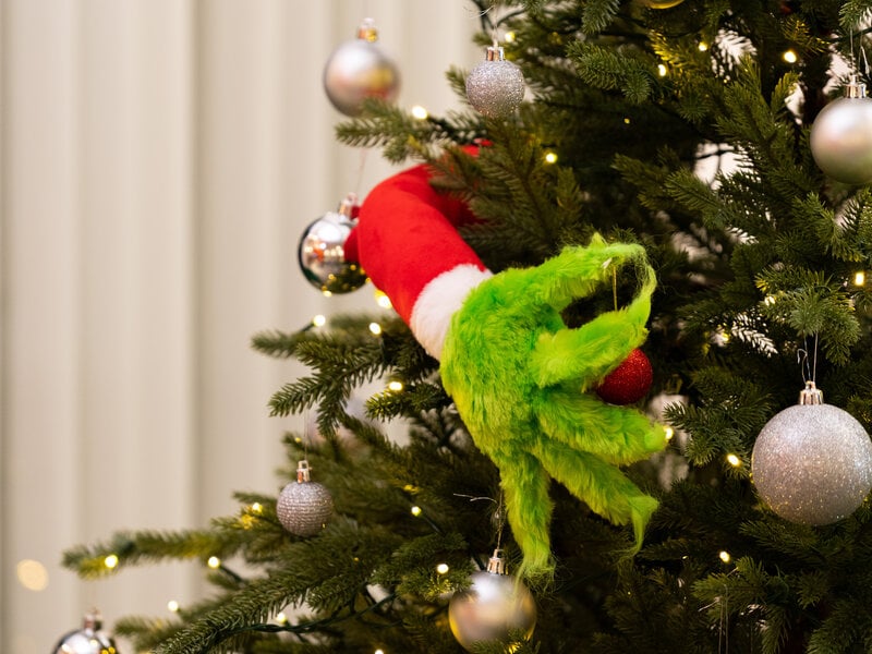 Den grųnne, lodne juletyv gemmer sig i juletręet og sigter efter julekuglerne... Eller er det bare en anden slags juletręspynt? Svęrt at sige, for det eneste, vi ser, er hans snedige arm