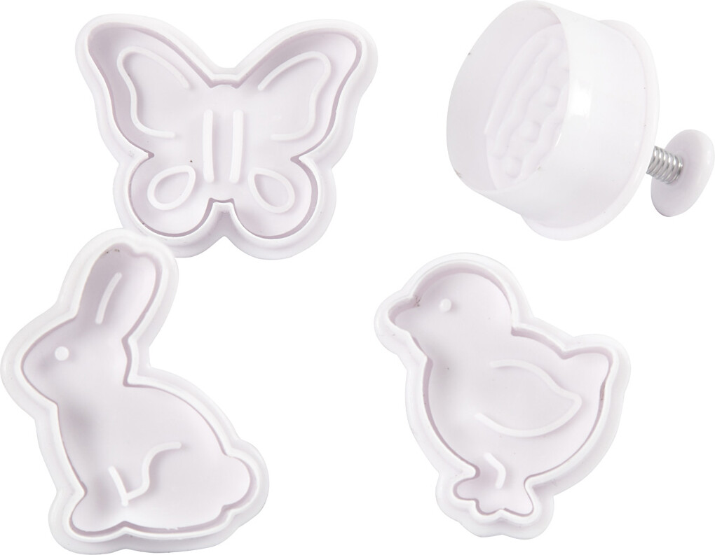 Skab søde påskeformer med dette sæt af fire udstikkere med præg til dine kreative projekter....