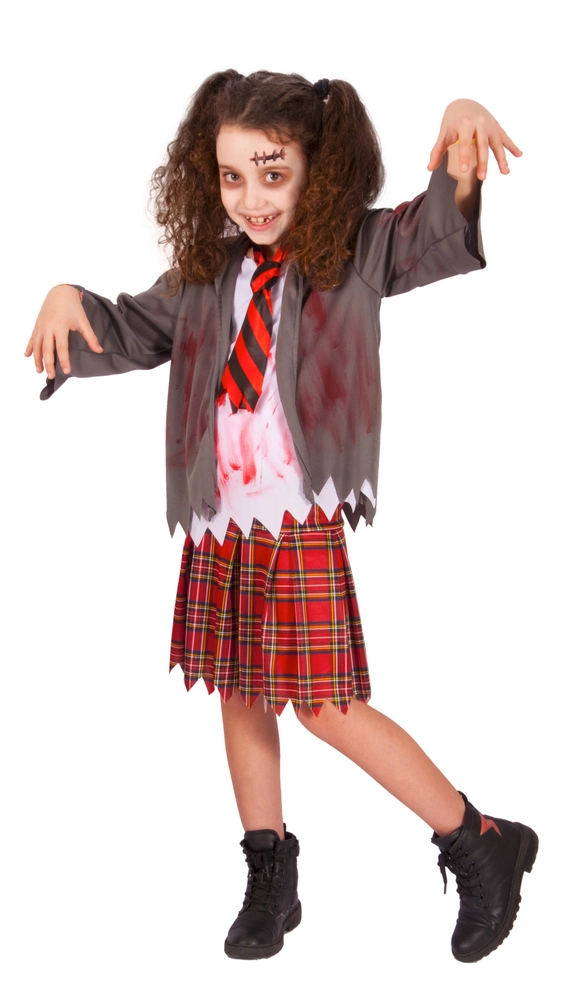 Dette Zombie pige-kostume inkluderer en jakke med en falsk skjorte, et slips og en nederdel. Størrelse 8-10 år. Perfekt til halloween