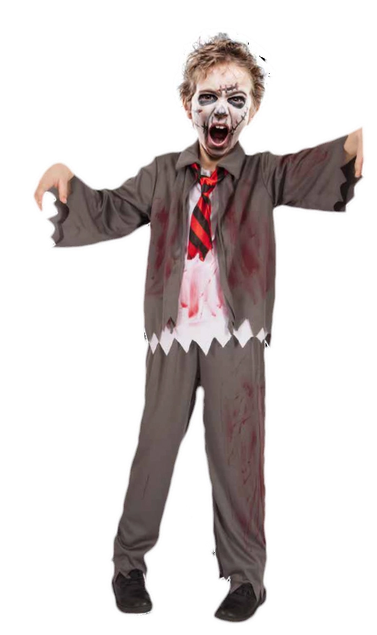Dette Zombie skoledreng-kostume inkluderer en jakke med en falsk skjorte, et slips og bukser. Størrelse 8-10 år. Perfekt til halloween